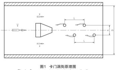 插入式蒸汽計(jì)量表實(shí)現(xiàn)流量測(cè)量的理論基礎(chǔ)是流體力學(xué)中**的“卡門渦街”原理,在流動(dòng)的流體中裝置一個(gè)非線性三角柱形體,即渦旋發(fā)生體,如圖 1 所示。當(dāng)流體沿渦旋發(fā)生體繞流時(shí),會(huì)在渦旋發(fā)生體下游產(chǎn)生兩列不對(duì)稱,但有規(guī)律交替地分離釋放出一系列漩渦束,只有當(dāng)兩渦漩列之間的距離 h 和同列的兩渦漩之間的距離 L 之比滿足 h/L=0.281 時(shí),所產(chǎn)生的渦街才是穩(wěn)定的。