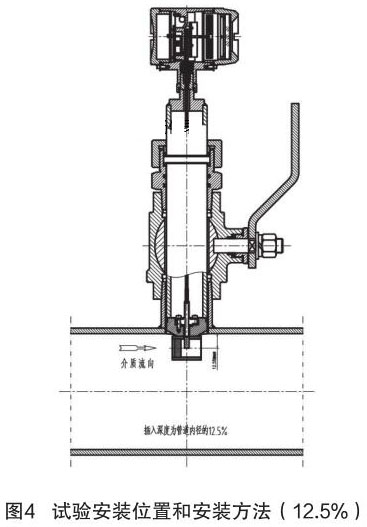 根據(jù)中華人民共和國(guó)機(jī)械行業(yè)標(biāo)準(zhǔn):JB/T9249-2015《蒸汽計(jì)量表》進(jìn)行插入式蒸汽計(jì)量表的研制與設(shè)計(jì)。在試驗(yàn)過程中,因?yàn)槔碚撗芯坎怀浞?,再加上?jīng)驗(yàn)不足,采用插入深度是按照以往其它產(chǎn)品(插入式電磁流量計(jì))的經(jīng)驗(yàn),以插入深度為現(xiàn)場(chǎng)管道內(nèi)徑的 12.5% 進(jìn)行試驗(yàn),其對(duì)介質(zhì)流量的檢測(cè)值與同種規(guī)格管道法蘭式結(jié)構(gòu)的蒸汽計(jì)量表進(jìn)行比較,偏差值較大、儀表準(zhǔn)確度無(wú)法滿足設(shè)計(jì)要求。試驗(yàn)安裝位置和安裝方法如圖 4 所示。