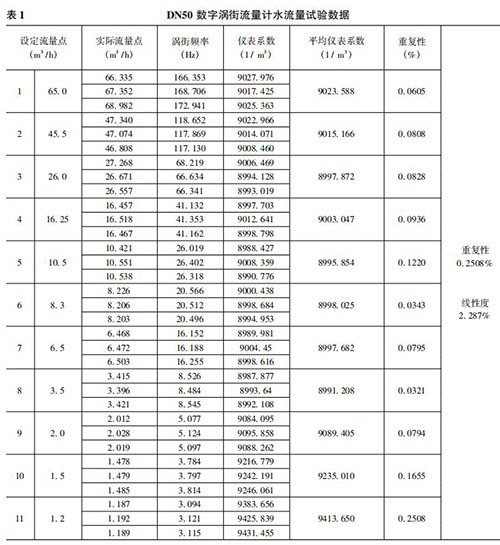 將本文實(shí)現(xiàn)的數(shù)字飽和蒸汽計(jì)量表在上述 50mm 口 徑( 簡(jiǎn)稱 DN50) 的水流量試驗(yàn)裝置上進(jìn)行試驗(yàn)。先在其正常流量范圍內(nèi)進(jìn)行試驗(yàn),流量從大到小逐漸降低,之后不斷探求其所能測(cè)量的*小流量。每個(gè)流量點(diǎn)試驗(yàn)三次,計(jì)算其重復(fù)性、平均儀表系數(shù)和線性度。水流量試驗(yàn)數(shù)據(jù)如表 1 所示。