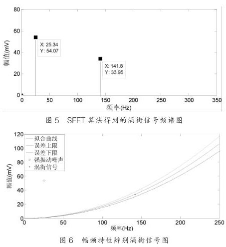 從圖 5 可以看出 SFT 算法能夠很好恢復(fù),對渦街信號的頻率恢復(fù)沒有誤差,而幅值的誤差不超過 1% ,這對含有強(qiáng)振動噪聲的渦街信號精確測量至關(guān)重要;圖 6 是經(jīng) SFT 頻譜分析所得到的數(shù)據(jù)通過幅頻特性曲線來辨別是噪聲信號還是渦街信號。通過幅頻關(guān)系的信號處理方法可以從含有振動的混合信號中識別渦街信號,從而達(dá)到提高供暖蒸汽流量計抗振動性能的目的。