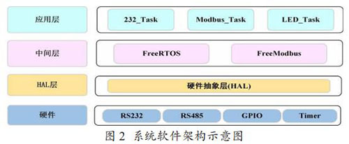 Modbus 通訊模塊的軟件架構(gòu)如圖 2 所示,分為硬件層、硬件抽象層,中間層和應(yīng)用層。中間層包括一個實時操作系統(tǒng)FreeRTOS 和一個針對嵌入式環(huán)境開發(fā)的輕量級 Modbus 協(xié)議庫Freemodbus。在應(yīng)用層,主要創(chuàng)建了三個任務(wù),232_Task 負責(zé)讀 取和解析流量計表頭輸出的文本信息,Modbus_Task 負責(zé)存儲 解析后的流量計數(shù)據(jù)到 Modbus 寄存器表,以及以 Modbus 協(xié)議與取水監(jiān)測設(shè)備通信,LED_Task 是一個輔助任務(wù),主要用來提示程序運行狀態(tài)。