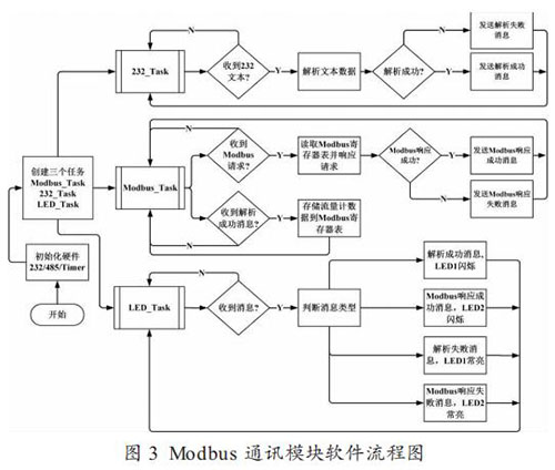 圖 3 為 Modbus 通訊模塊的軟件流程圖,創(chuàng)建的三個任務(wù)都是以 FreeRTOS 系統(tǒng)的消息(Message)來驅(qū)動。