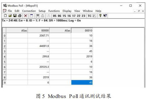 Modbus Poll 通訊測試結(jié)果如圖 5 所示:Tx = 24140,Err =0,ID = 1,F(xiàn) = 04,SR = 1000ms,Log = on。 其中 ,Tx 為Modbus Poll 發(fā)送命令次數(shù),也就是說在測試期間 Modbus Poll軟件共發(fā)送讀輸入寄存器命令 24140 次(發(fā)送間隔為 1s,測試時間為 6.7 小時);Err 為通訊錯誤數(shù),Err = 0 表明 Modbus 通訊模塊正確響應(yīng)次數(shù)為 24140 次(錯誤數(shù)為 0)。