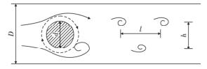 渦街流量表是由漩渦發(fā)生體、頻率檢測器和信號轉(zhuǎn)換器等環(huán)節(jié)組成,輸出 4 ~ 20 mADC 信號或脈沖電壓信號。其測量原理是在流動的流體中的垂直流動方向安放 1 根或多根非流體型阻流體,在一定的流量范圍內(nèi),流體在阻流體兩側(cè)交替地分離、釋放出 2 串頻率正比于管道內(nèi)的平均流速、規(guī)則的、不對稱有規(guī)律的交替漩渦列,如圖 1 所示,且兩側(cè)漩渦旋轉(zhuǎn)方向相反 。采用檢測元件測出漩渦頻率就可以推算出流體的流量。