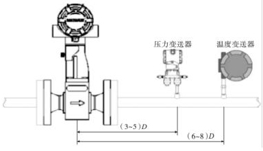 渦街流量表的口徑如果與工藝管道相同,不能滿足流量儀表要求時,或者在此流速下測量準確度不能保證時,需要縮小儀表口徑,從而提高管內(nèi)流速,保證測量精度。上下游必須有足夠的直管段,若傳感器安裝點的上游在同一平面上有 2 個 90°彎頭時,上游直管段≥25D,下游直管段≥5D。根據(jù)測量的需要,需在渦街流量表附近測量壓力和溫度時,測壓點應在傳感器下游的(3 ~5)D 處,測溫點應在傳感器下游的(6 ~8)D 處,如圖 3 所示。