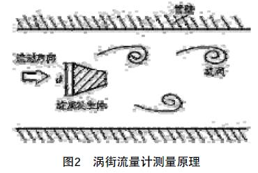 在流體中設(shè)置旋渦發(fā)生體,則從旋渦兩側(cè)交替產(chǎn)生有規(guī)則的旋渦,這種旋渦稱為卡門(mén)旋渦,如圖2所示,旋渦列在旋渦發(fā)生體下游非對(duì)稱地排列。旋渦流量計(jì)是根據(jù)卡門(mén)渦街原理測(cè)量氣體、蒸汽或液體的體積流量、標(biāo)況的體積流量或質(zhì)量流量的體積流量計(jì)。并可作為流量變送器應(yīng)用與自動(dòng)化控制系統(tǒng)中。