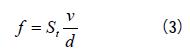 式中:f為渦街頻率,Hz;tS為斯特羅哈爾常數(shù)(無(wú)量綱);v為流體經(jīng)過(guò)發(fā)生體時(shí)的平均流速,m/s;d為發(fā)生體的特征寬度,m。