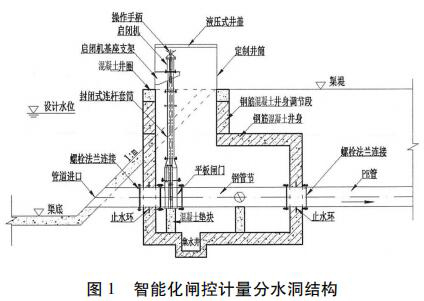 分水洞采用了一種封閉式啟閉閘集成閘井預制件,包括頂節(jié)、標準節(jié)和底座。與傳統(tǒng)現(xiàn)場澆筑的方式相比,集成閘井采用防水設計,并且安裝更加方便快捷,很大程度上提高了安裝效率,節(jié)約成本。采用事先預制好的啟閉閘支座、啟閉機機座,保證了設備的安裝精度,提高了設備運行的穩(wěn)定性,減少了設備的后期維護。分水洞結構除了預制混凝土外,還可考慮采用玻璃鋼或工程塑料整體制作,用標準節(jié)調(diào)節(jié)高度。分水洞結構設計見圖 1。