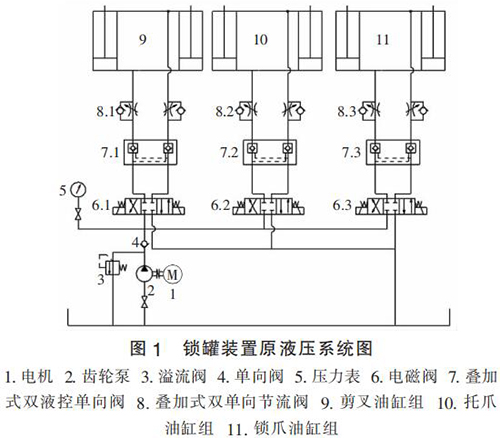 丙烷氣流量計(jì)原液壓系統(tǒng)圖如圖 1 所示。 通過分析圖 1 發(fā)現(xiàn),原液壓系統(tǒng)中剪叉油缸組、托爪油缸組及鎖爪油缸組并聯(lián)安裝,并均由齒輪泵供油,該系統(tǒng)設(shè)計(jì)簡(jiǎn)單,液壓元件選擇不夠合理,工作效率低,電機(jī)發(fā)熱大,主要存在的問題: