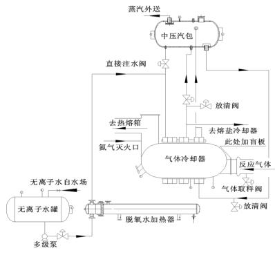 來自無離子水罐的脫氧水經(jīng)多經(jīng)泵加壓、經(jīng)脫氧水加熱器加熱后進入到主蒸汽流量計的水段,脫氧水與反應氣體換熱后分兩路:一路進入中壓汽包,保證汽包有穩(wěn)定的液位;一路進入熔鹽冷卻器帶出熔鹽攜帶的反應熱。來自中壓汽包的高溫水經(jīng)管路接至主蒸汽流量計汽段底部,高溫水與反應氣體換熱后產(chǎn)生高壓蒸汽,高壓蒸汽又返回中壓汽包。汽包還有一路直接注水管路,此路水不經(jīng)過主蒸汽流量計水段,而是直接進入汽包。在主蒸汽流量計出口溫度偏低而汽包液位也比較低時,可開此直接注水管路來穩(wěn)定汽包液位。其詳細流程圖如圖 2。
