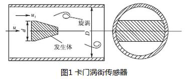渦街流量計是根據(jù)“卡門渦街”原理研制成的流體振蕩式流量測量儀表。在一定雷諾數(shù)范圍內(nèi)旋渦的分離頻率與旋渦發(fā)生體的幾何尺寸、管道的幾何尺寸有關(guān),旋渦的頻率正比于流量,其結(jié)構(gòu)原理如圖1所示。