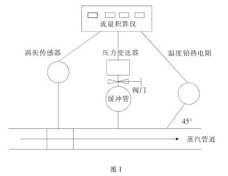 蒸汽作為重要的二次能源廣泛應(yīng)用于工業(yè)生產(chǎn)當(dāng)中。蒸汽的計量是蒸汽使用過程中重要的一環(huán),蒸汽流量計的準(zhǔn)確性關(guān)系到供、用雙方的經(jīng)濟利益。蒸汽流量計又是由多個計量器具組成的一個計量系統(tǒng)。而蒸汽流量計大都安裝在高溫、高壓的蒸汽管道上,不方便拆卸,如何提高蒸汽流量計現(xiàn)場檢測技術(shù)就變得非常重要。目前常見的用于計量蒸汽的流量計一般有兩種:渦街流量計和差壓式流量計。渦街流量計主要由渦街流量傳感器、流量積算儀、壓力變送器、溫度鉑熱電阻組成。差壓式流量計主要由標(biāo)準(zhǔn)孔板、差壓變送器、流量積算儀、壓力變送器、溫度鉑熱電阻等組成。渦街流量計由于其結(jié)構(gòu)簡單、牢固、安裝維護方便。目前在市場上的應(yīng)用越來越廣泛。渦街流量計安裝示意圖如圖1: