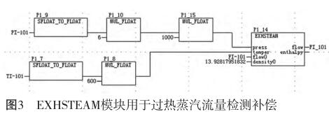 其中COMPENSATE模塊適用于溫度為260~800℃,壓力(絕壓)為0.5~32MPa的工況;而EXHSTEAM模塊適用于溫度為140~560℃,壓力(表壓)為98.6777~15898.6777kPa的工況。假設過熱蒸汽的設計壓力為4MPa(表壓),設計溫度為400℃;過熱蒸汽的實測壓力為PI-101:0~6MPa(表壓),實測溫度為TI-101:0~600℃,流量為FI-101,補償后的流量為FI_101,經EXHSTEAM過熱蒸汽特性計算得出設計密度為13.92817951832kg/m³,則DCS圖形化編程如圖3所示。