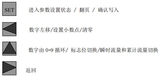 設置小數點:直接按 SET 鍵確認,進入默認流量參數設置菜單,顯示屏顯示 QP,按數字↑ 鍵設置標志位。按數字← 鍵設置小數點,按→鍵可以返回菜單選擇項。
