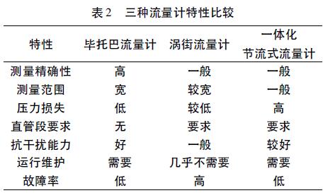根據(jù)三種流量計(jì)的特點(diǎn),從測量精確度、測量范圍、壓力損失、抗干擾能力及運(yùn)行維護(hù)等方面進(jìn)行比較,如表2所示。