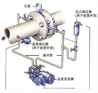 通過(guò)引壓管將差壓信號(hào)引入差壓變送器,差壓變送器將差壓信號(hào)送入流量積算儀,積算儀將差壓信號(hào)換算成流量信號(hào)。同時(shí)通過(guò)溫度和壓力傳感器測(cè)出蒸汽的溫度和壓力,積算儀根據(jù)當(dāng)時(shí)的溫度和壓力計(jì)算出補(bǔ)償后的流量。